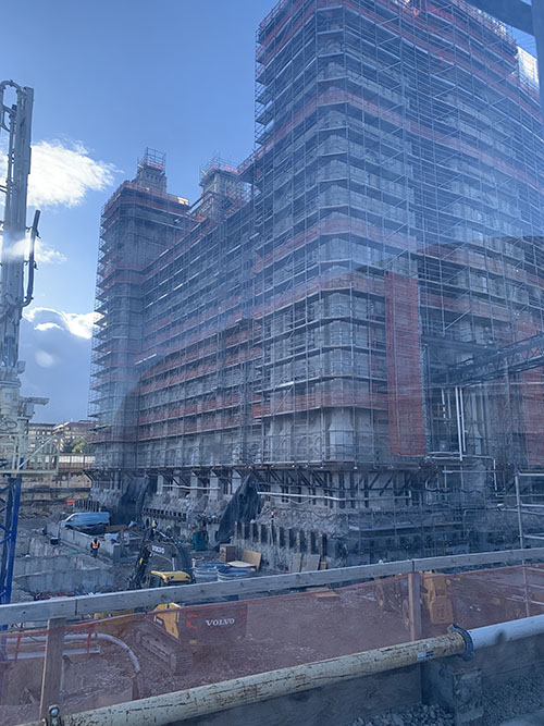 This is a view of the lower portion of the west end of the temple. The circular holes at the bottom will have steal strands placed through them from side to side. These steel ropes will hold the temple in the air while the base isolators (that guard agaist earthquake dammage) are installed.