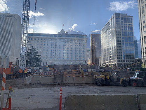 Excavation is starting on the south side of the temple for the new Visitor's Center which will probably be known as the "Temple Experience Center." In the background is the Joseph Smith Memorical Building.
