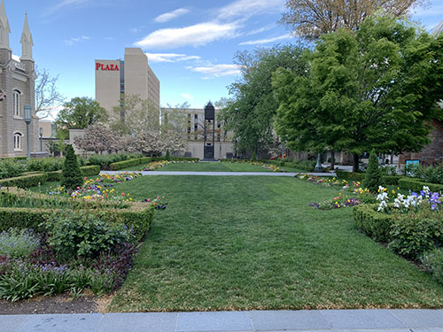 The area between the Tabernacle and the Assembly Hall is the only place to find spring flowers in 2022.