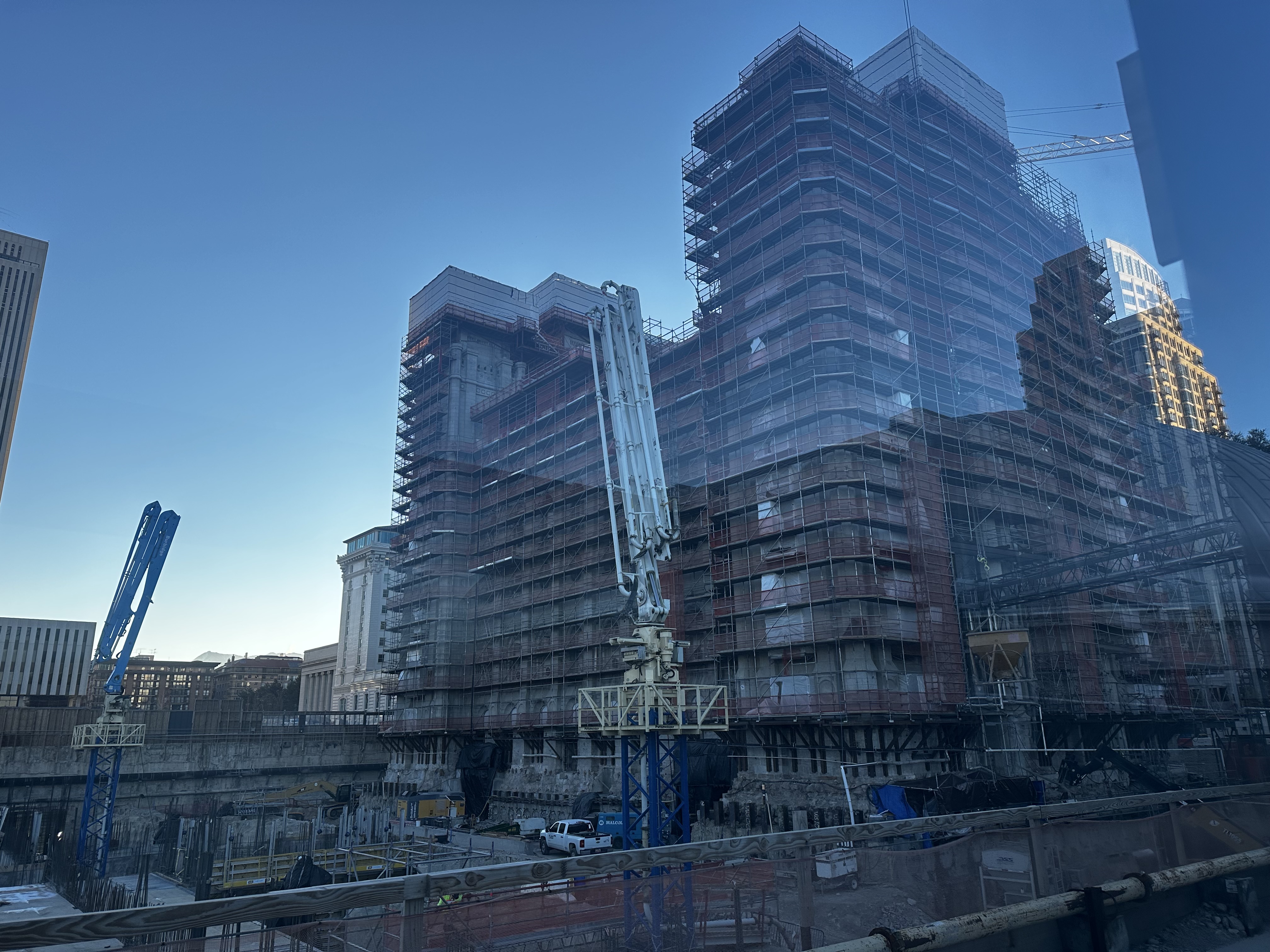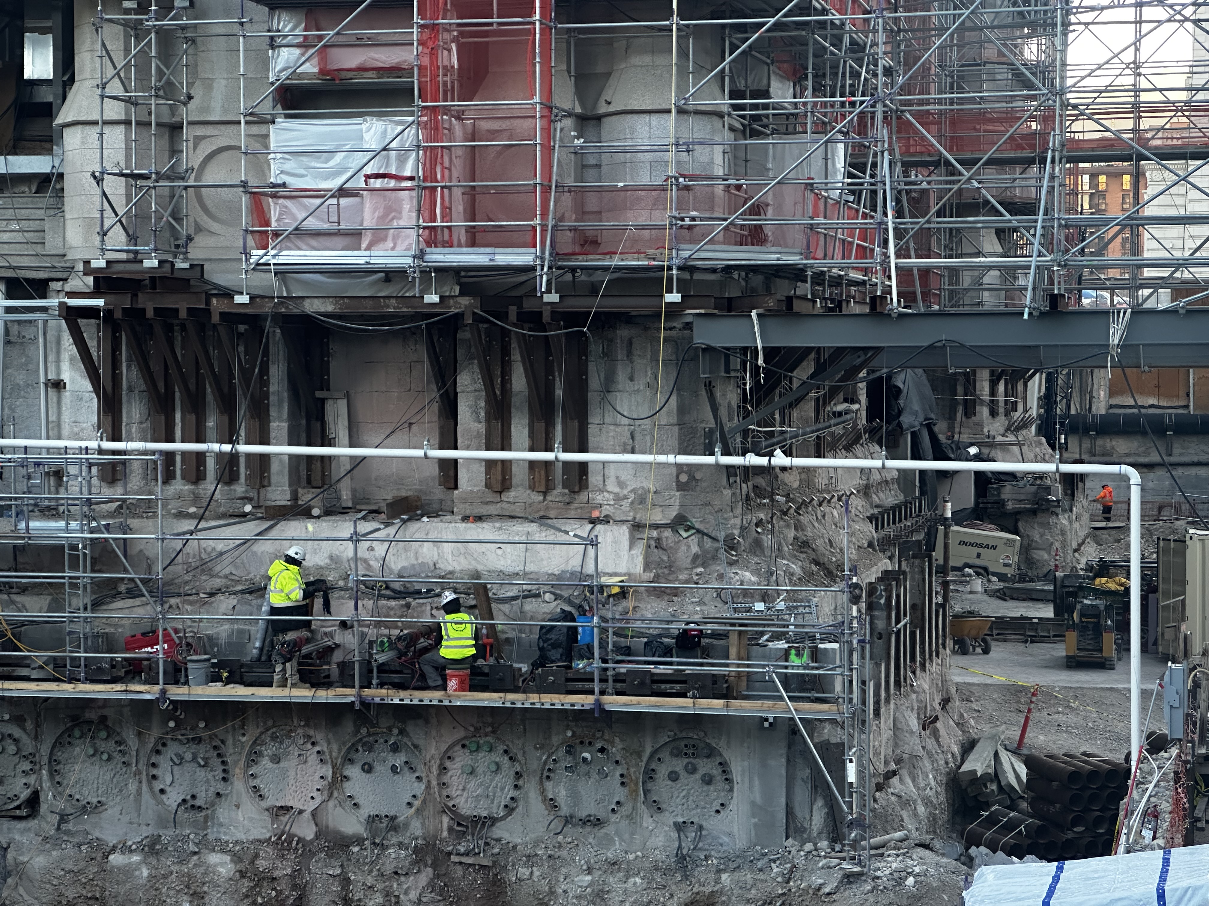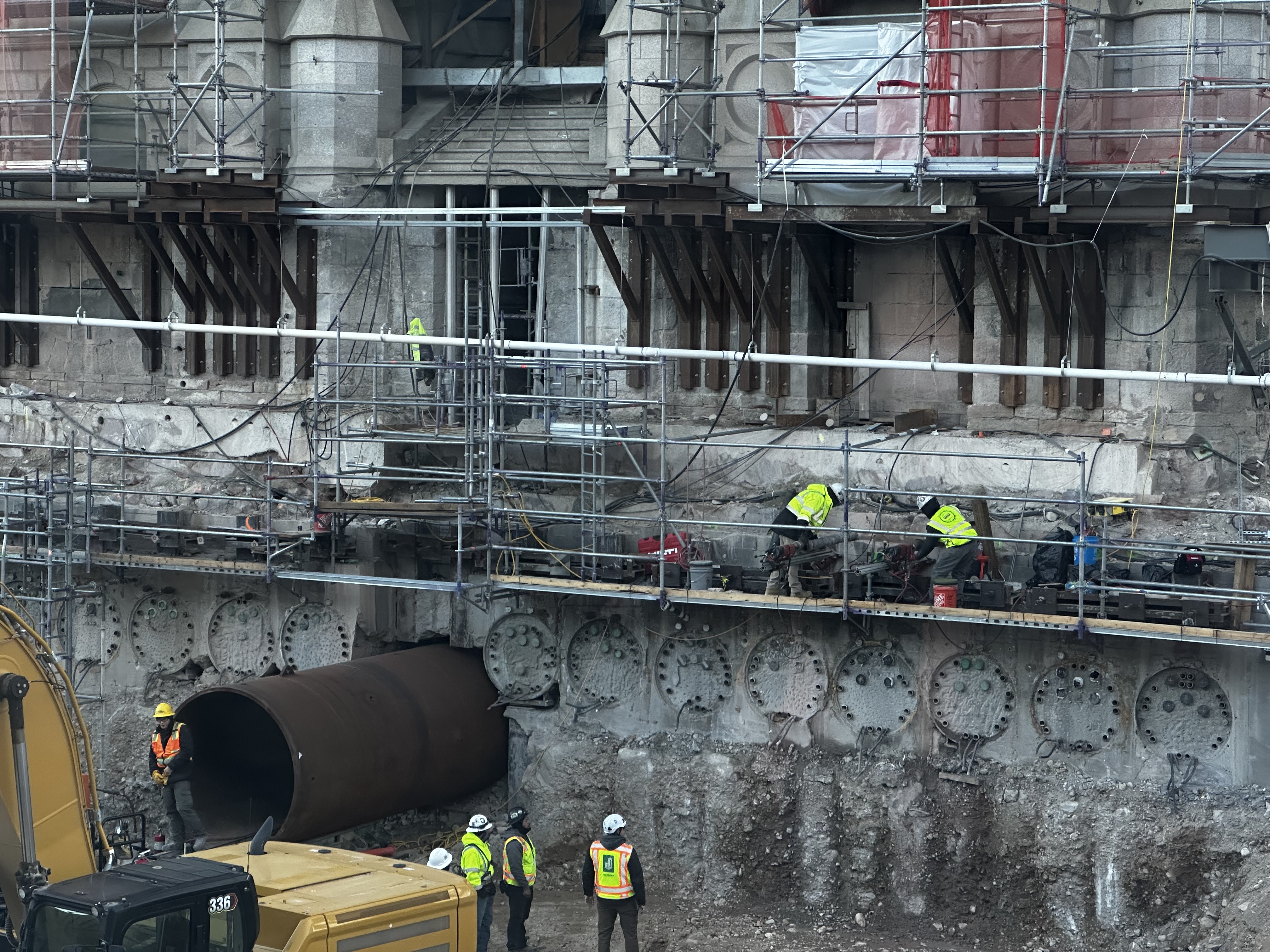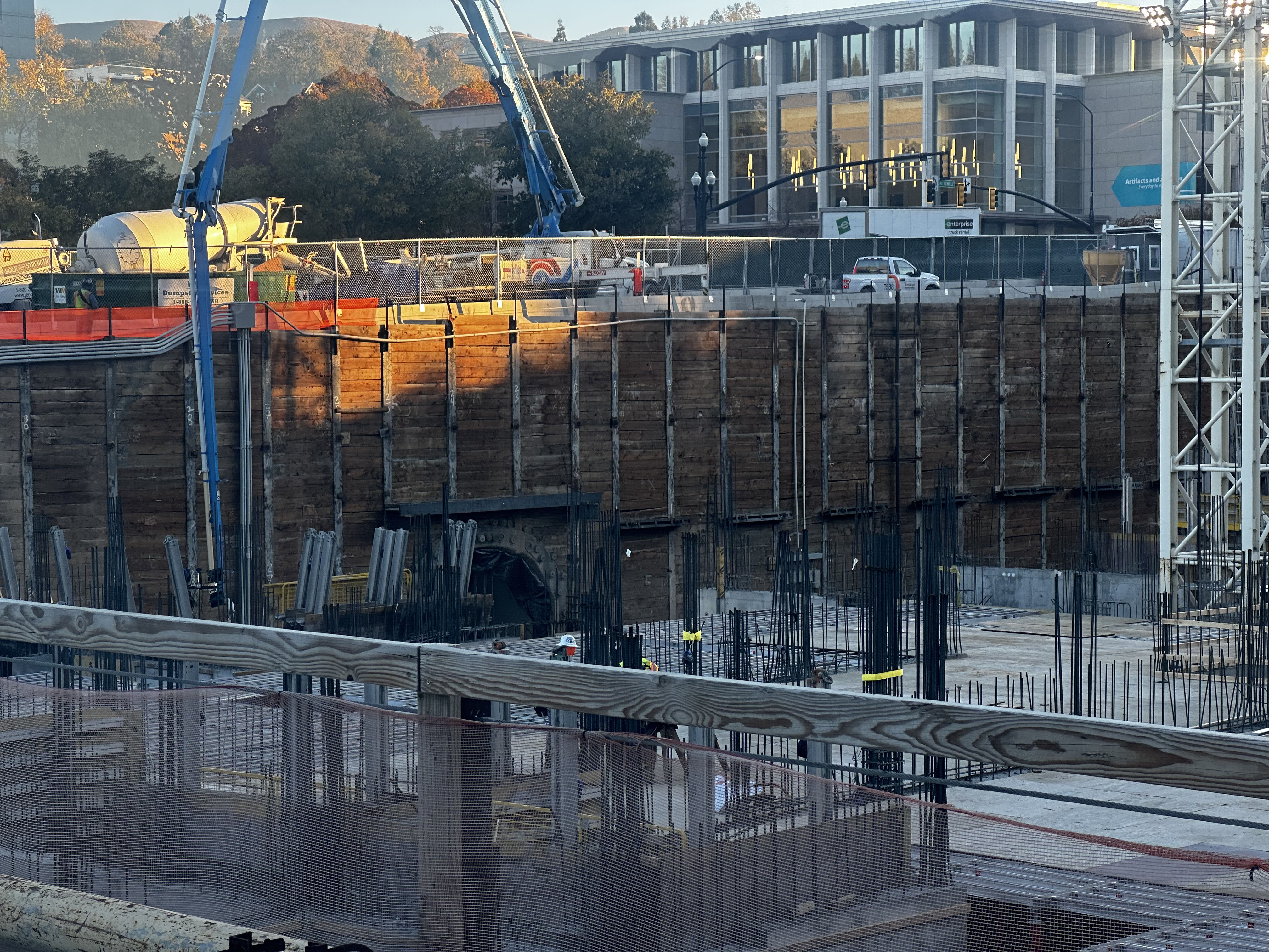 Temple - From the outside, it looks much like it did six months ago. However, there is now a large pipe, 6-8 feet in diameter, that appears to run East-West under the center of the temple, below the 'Jack and Bore' pipes. Those pipes have been constructed to hold the temple in the air while the base isolators are installed. The spires on the east side are shrouded in material, suggesting that some work is being done there that requires temperature control or perhaps just for winter protection.