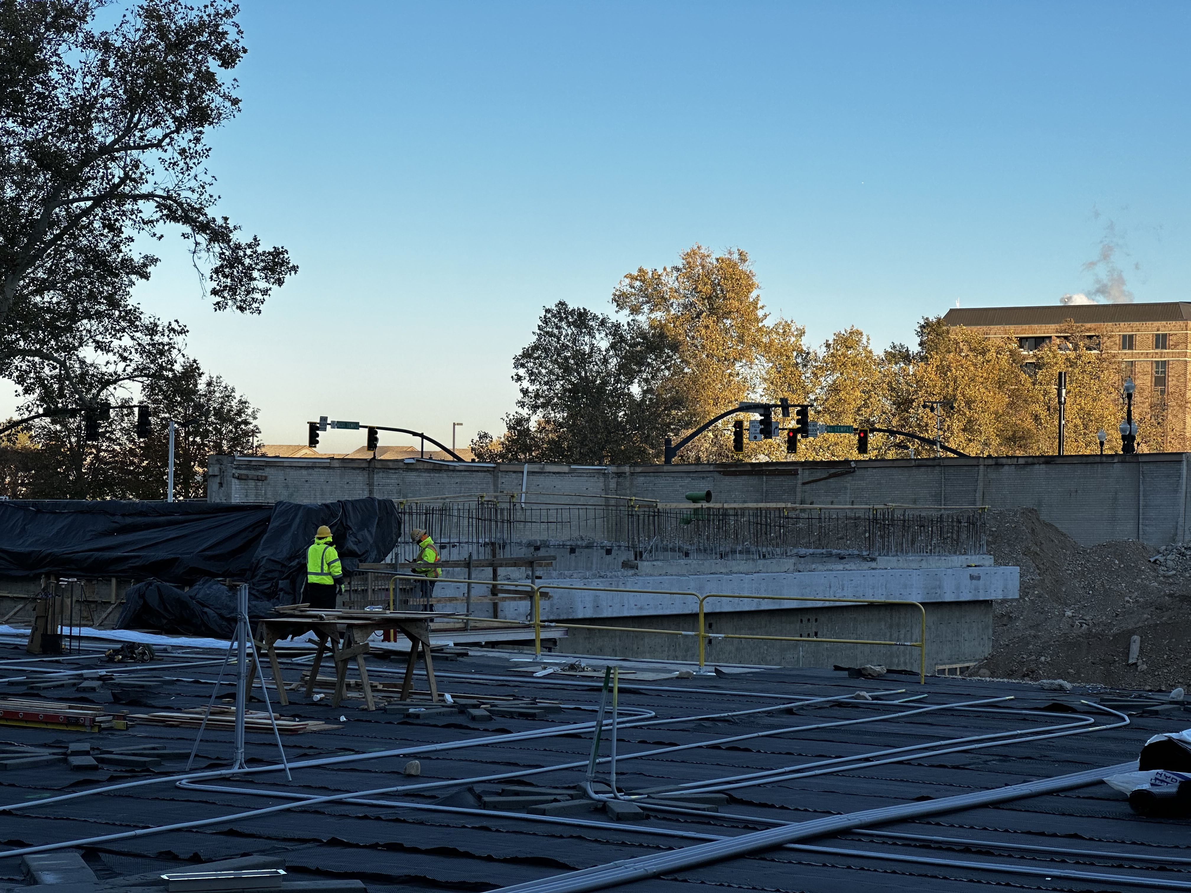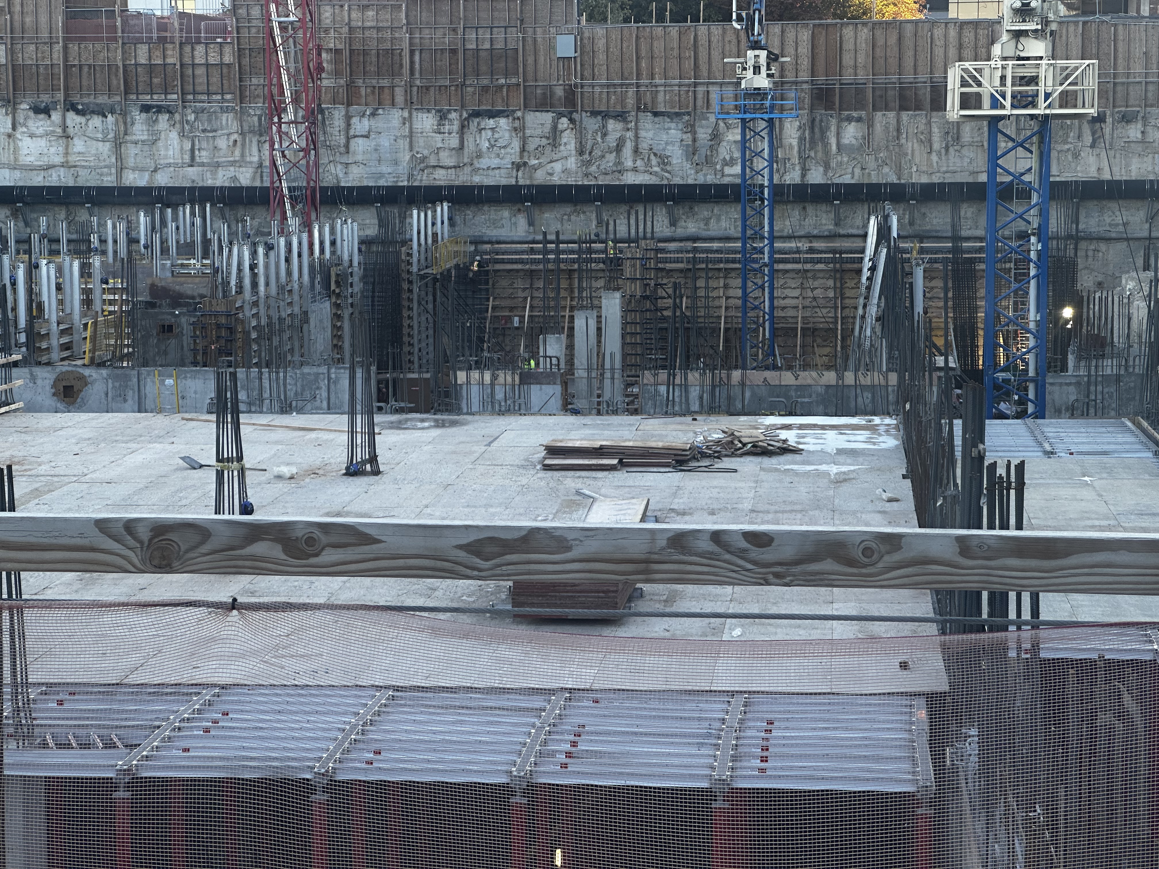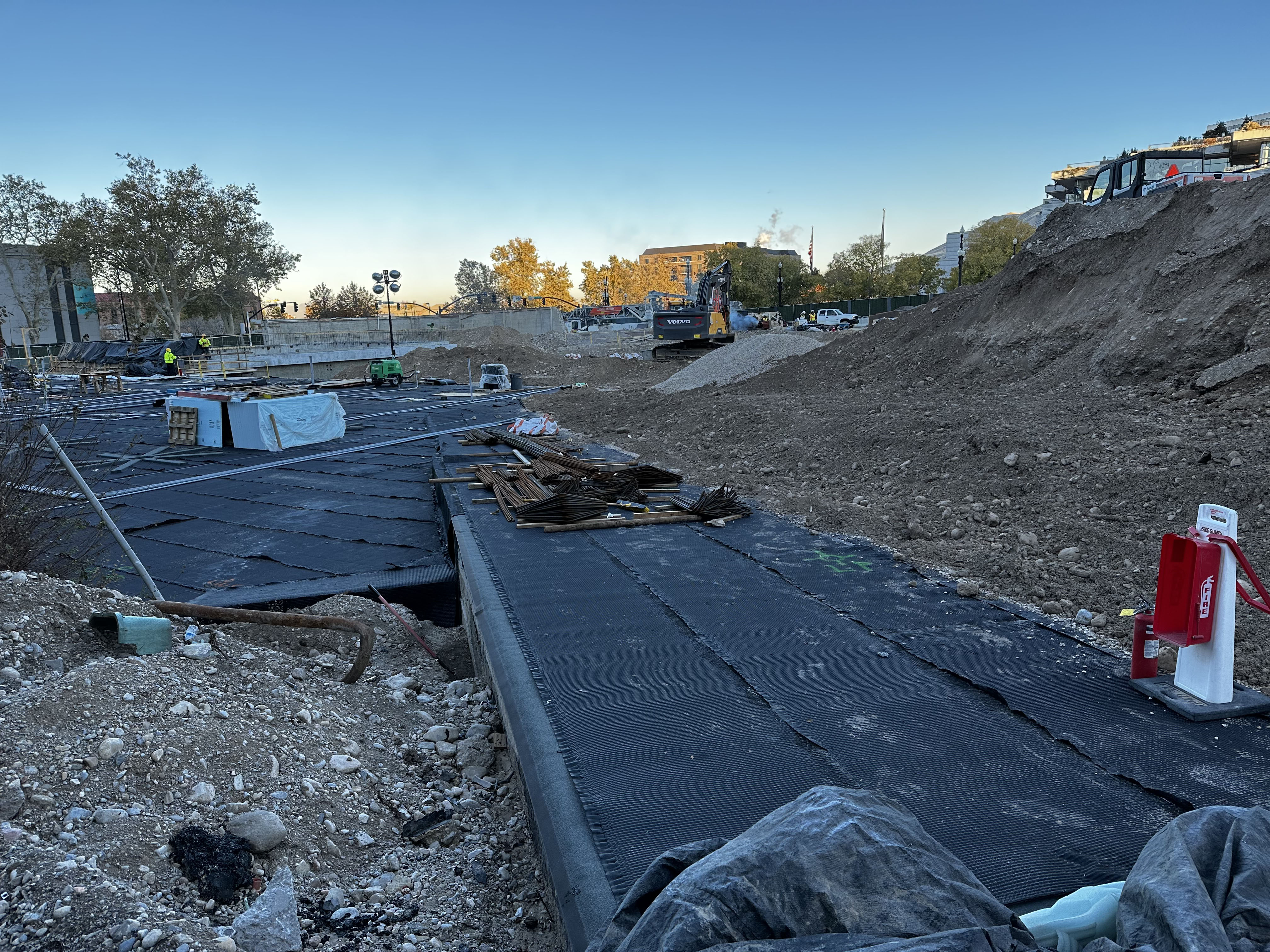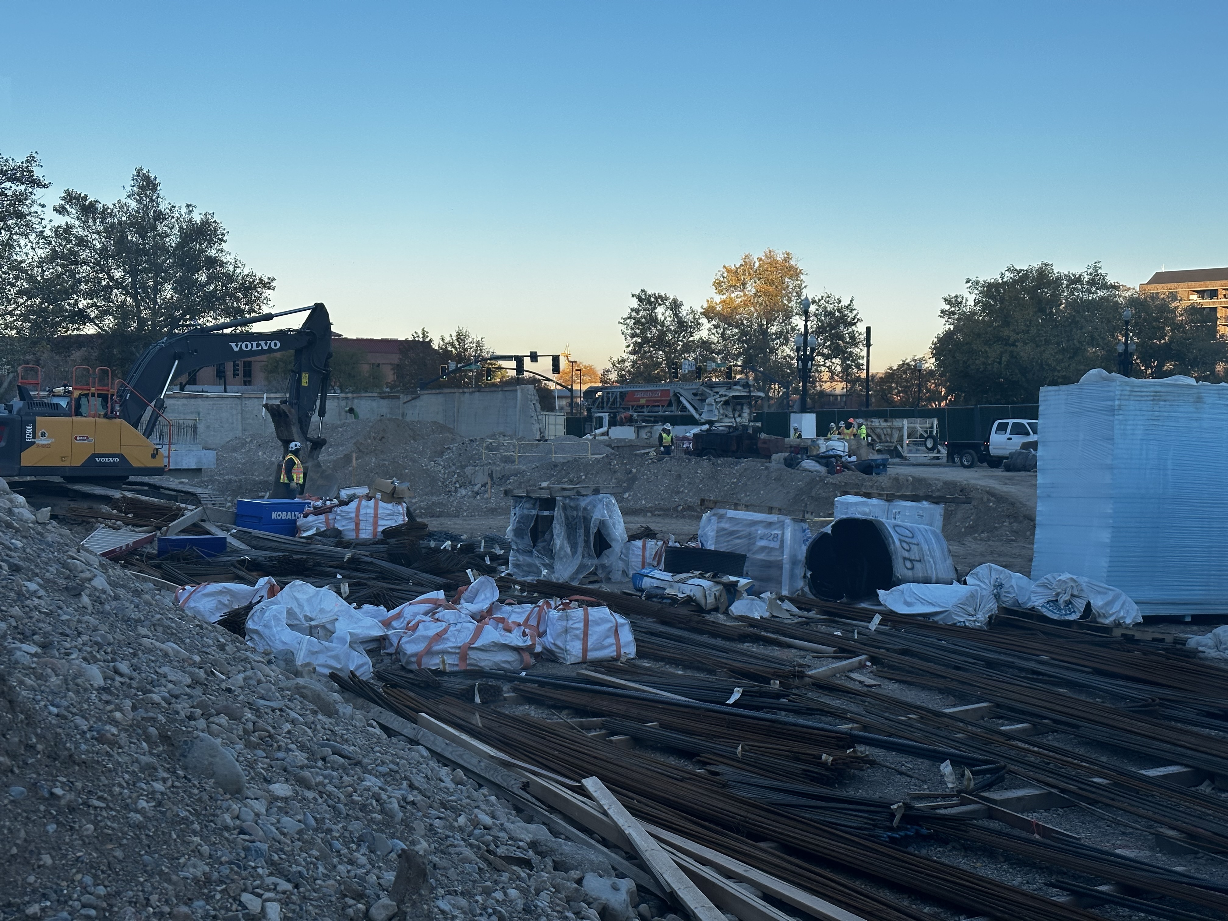 Many construction materials are on site, including rebar, indicating much more concrete to come. A large pile of dirt also remains, suggesting it will be used as fill dirt.
