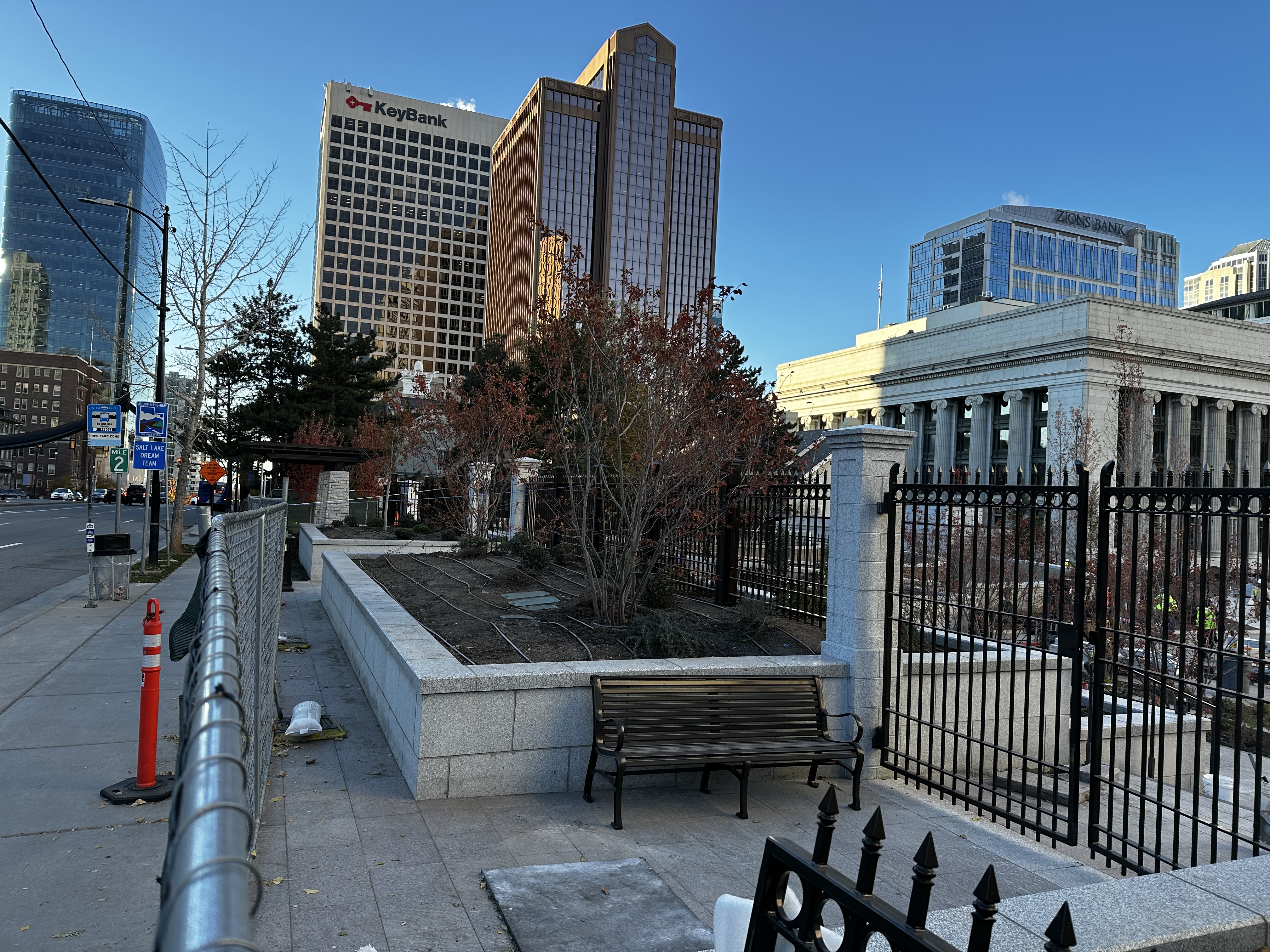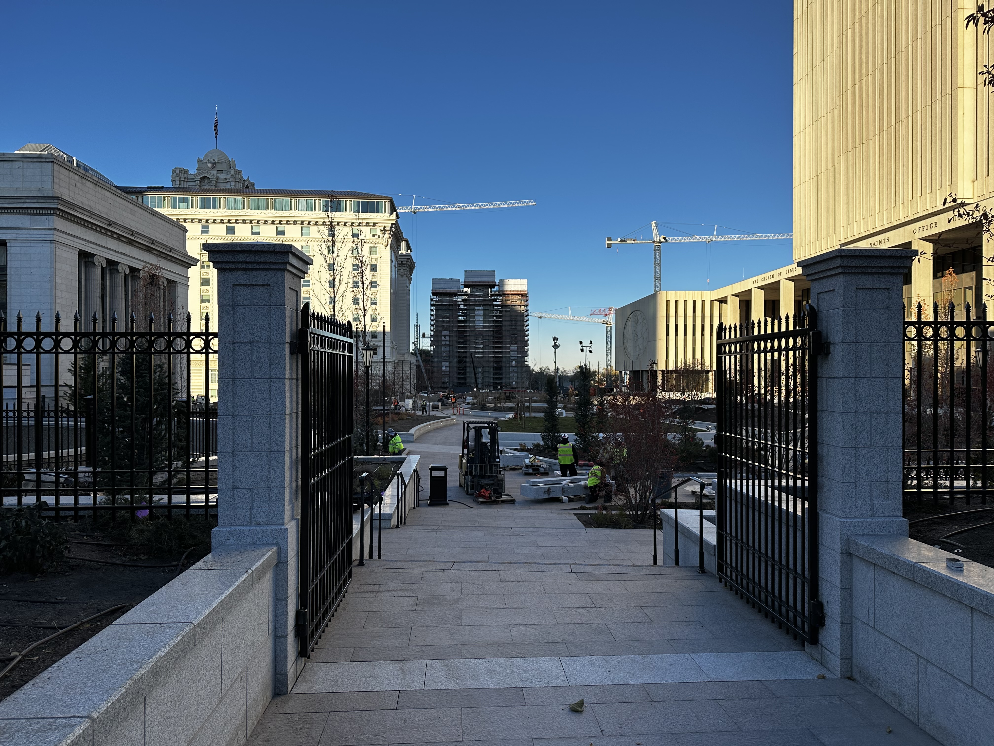 The center gate along State Street to the new Church Office Building Plaza is open. The new plaza seems to be nearly complete.
