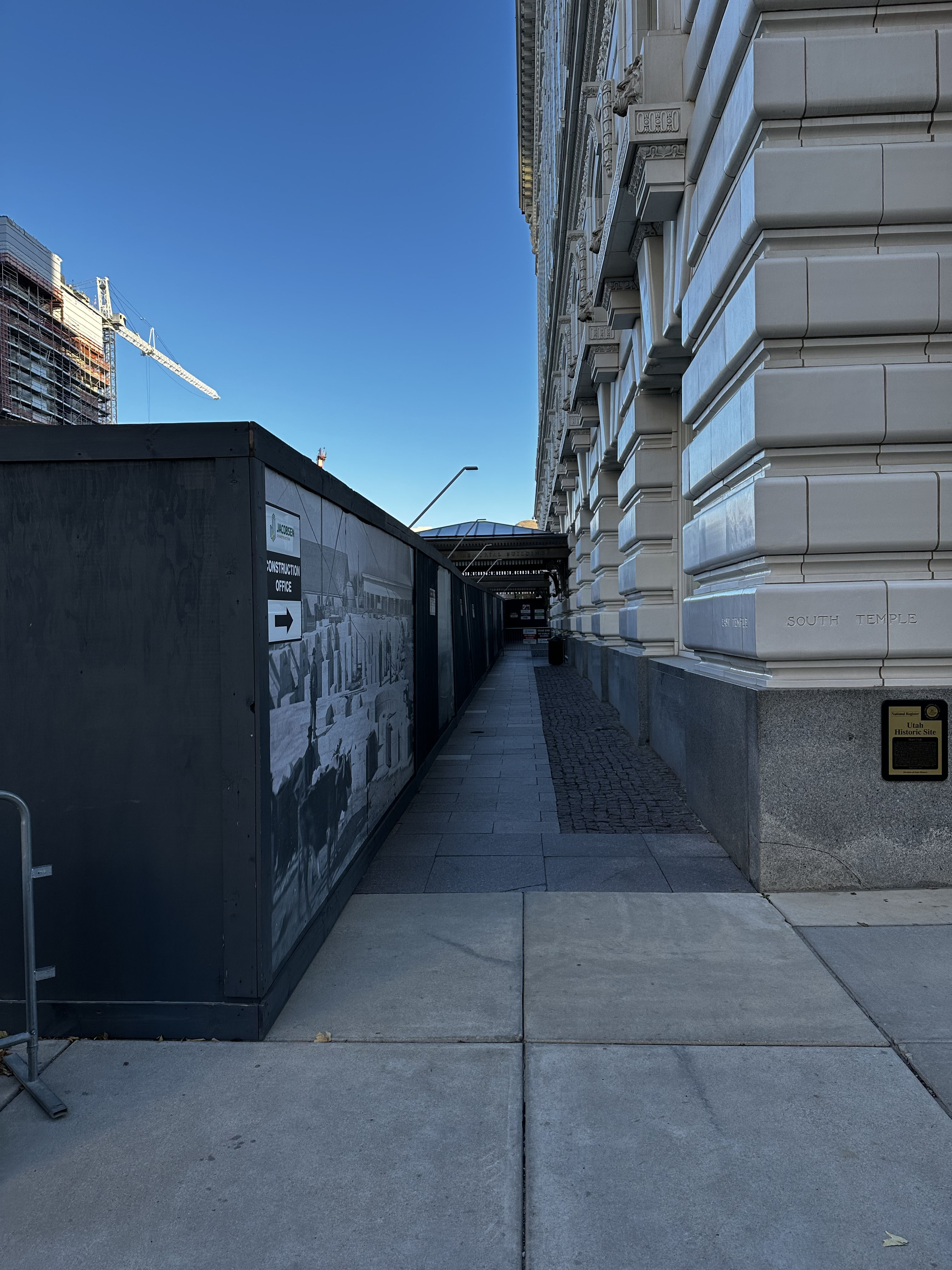 Alleyway along the west side of the Joseph Smith Memorial Building at South Temple. The baracade on the left is a constructtion wall as some things on Main Street Plaza are being renovated. The alleyway leads to the west door of the Joseph Smith Memorial Building.
